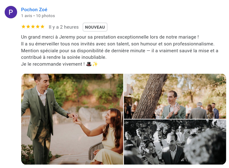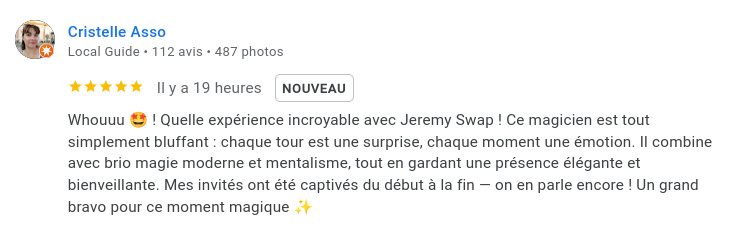 Il a su créer une atmosphère mystérieuse et enchanteresse qui a laissé nos invités bouche bée. Jeremy est un artiste très charismatique et sympathique. Il a rendu notre soirée privée mémorable et unique. Si vous recherchez une animation magique pour votre prochain événement à Nice, nous vous recommandons vivement Jeremy Swap